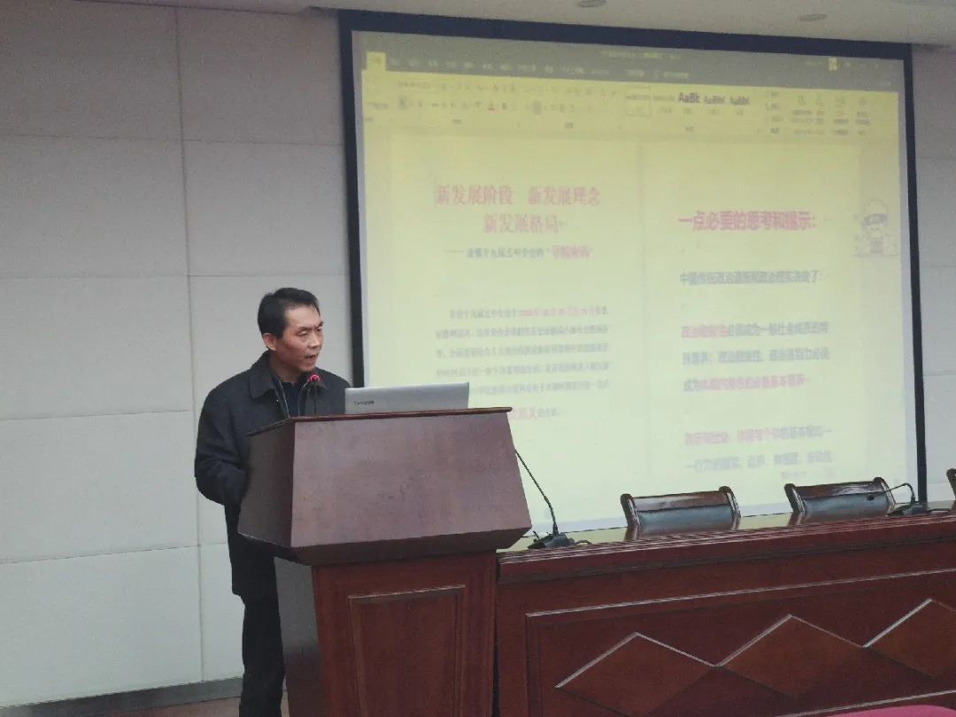 12月23日,pg电子官方网站邀请校党的十九届五中全会宣讲团成员、马克思主义学院副教授苟昭赟做题为“新发展阶段 新发展理念 新发展格局——读懂十九届五中全会的导航密码”主题报告。他提出,要真正把学习中央文件精神作为我们工作的思想指引,围绕“新阶段、新理念、新格局”的逻辑主线讲述了《中共中央关于制定国民经济和社会发展第十四个五年规划和二〇三五年远景目标的建议》(以下简称《建议》)的主要内容,新发展阶段就是全面建设社会主义现代化国家、向第二个百年奋斗目标进军的阶段;新发展理念是创新、协调、绿色、开放、共享的发展理念,具有战略性、纲领性、引领性;新发展格局是构建以国内大循环为主体、国内国际双循环相互促进的“双循环”新发展格局。自觉认识和把握这条逻辑线索,才能高屋建瓴地把握《建议》的“魂”和“纲”,清晰通透的辨明《建议》的“总”和“分”。