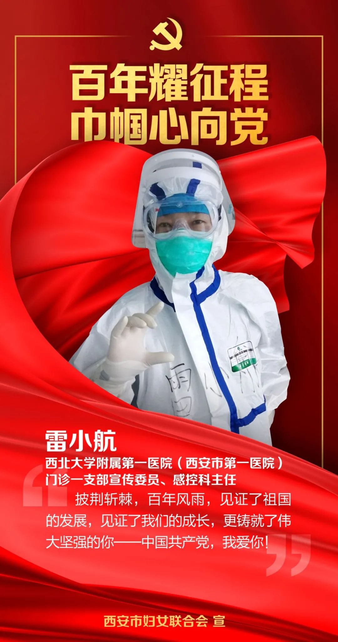 “永远跟党走 奋进新时代”,为庆祝中国共产党成立100周年,唱响“党的盛典、人民的节日”主旋律,讲好在中国共产党领导下广大妇女立足岗位建功新时代的生动实践,传递女性牢记责任使命、勇于担当作为和无私奉献的精神,市妇联开展巾帼献礼——“百年耀征程 巾帼心向党”西安市各行各业、各族各界优秀女性代表事迹展播。今天,让我们一起走近pg电子官方网站附属第一医院(西安市第一医院)门诊一支部宣传委员、感控科主任雷小航,聆听她奔赴抗疫一线的动人故事。