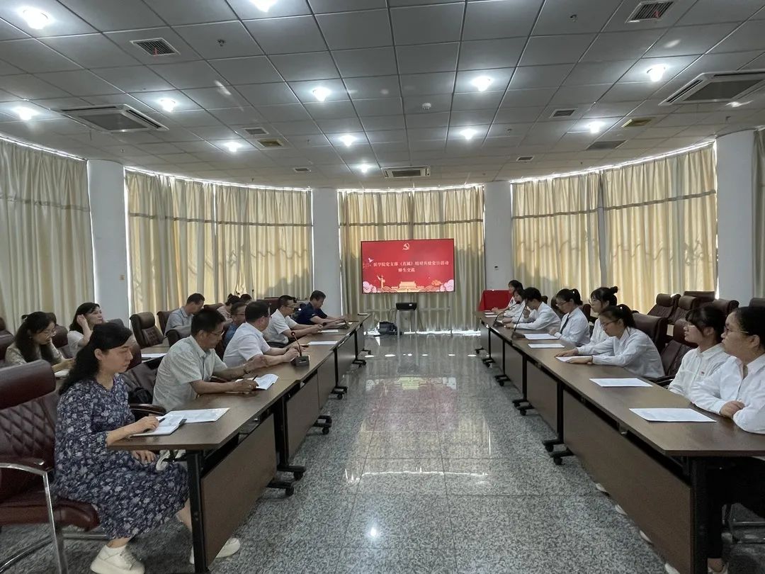 为庆祝中国共产党成立101周年,深化基层党组织合作共建,2022年7月1日上午9:00,工会统战联合党支部与医学院党支部联合举办“迎七一”主题党日活动,进一步加强党支部文化建设,夯实基层党建质量。机关党委书记曹振纲,医学院院长赵钢,党委统战部部长、工会统战联合党支部书记董国强,工会统战联合党支部与医学院直属党支部师生党员参加此次党日活动。活动由党委统战部部长、工会统战联合党支部书记董国强主持。