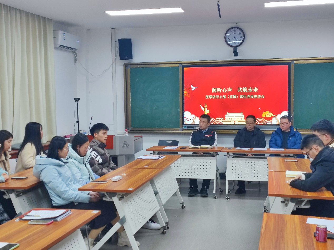 为扎实推进习近平新时代中国特色社会主义思想主题教育走实走深,贯彻党的群众路线,着力强化基层党组织建设,促进师生间友好紧密交流,2023年12月15日,医学院党支部(直属)召开师生党员座谈会,学院领导班子、党员代表及各年级学生代表参加座谈,会议由学院党支部(直属)副书记杨涛主持。
