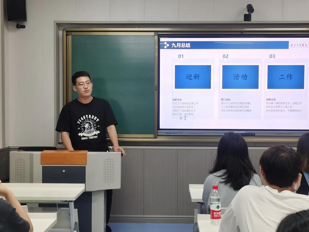 各部门工作人员对九月工作进行总结,并规划十月工作。学生会将继续完善学风考勤制度,推进拉拉队、篮球队培训工作,同时增进内部交流,着力提升学生会凝聚力和向心力。
