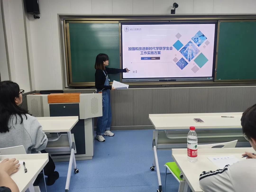 学生会主席团成员赵清淼领学《加强和改进新时代学联学生会工作实施方案》,结合最新述评文章《全国学联:清新阳光的学生会容不得颐指气使的“学生官”》分享心得体会,并带领全体工作人员回顾了《关于学联学生会工作人员改进作风服务同学的若干规定》。她强调医学院学生会仍在建设发展过程当中,应积极深入领会全国学联二十七大精神,牢记服务同学宗旨,力争树立起富有理想,关心同学,清新阳光的组织形象。