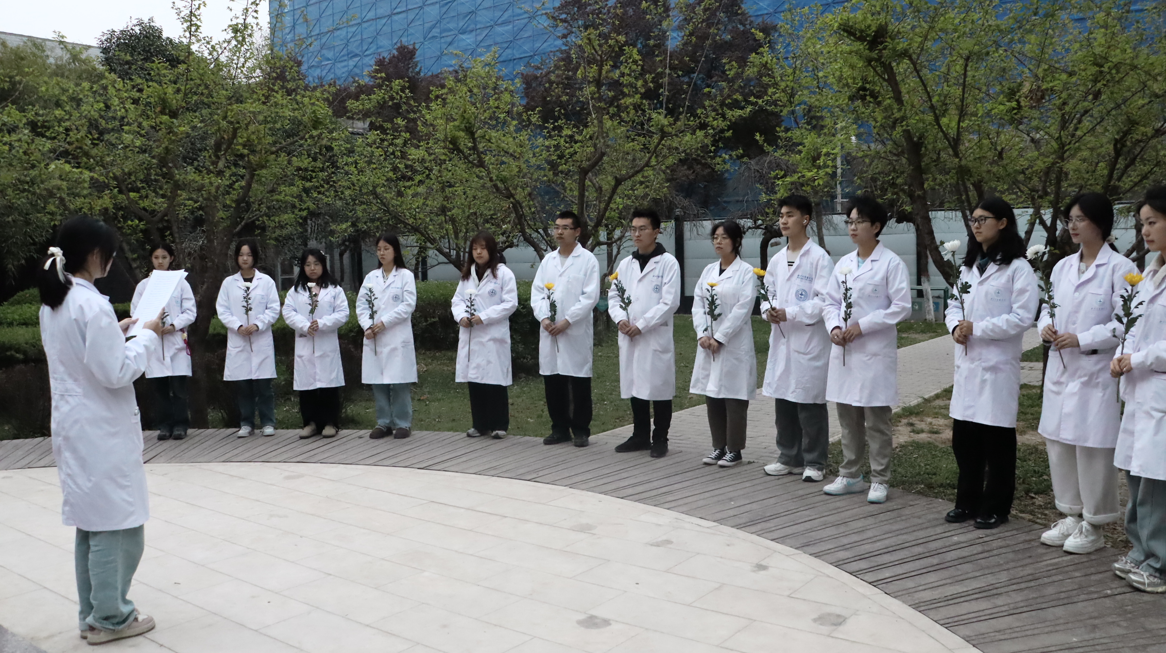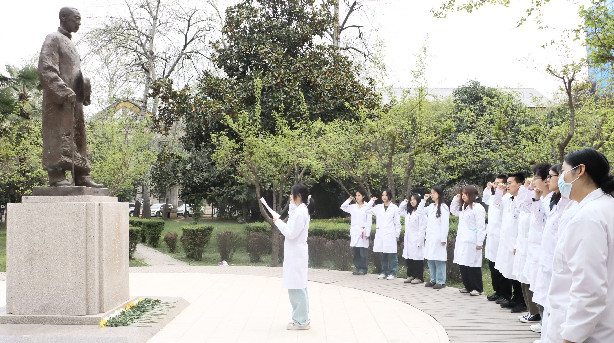 活动现场素花环绕,徐诵明先生的全身雕像肃然矗立。仪式在庄重的氛围中开始。师生代表缓步上前,向雕像献花并致敬,表达对先贤的追念。学生代表带领现场师生回顾了徐诵明先生作为中国现代医学教育开拓者的毕生追求,强调其“教育救国、医学报国”的信念对当代医学人才培养的深刻启示,以徐诵明先生抗战时期临危受命、重建西北医学院的事迹为例,勉励师生“将爱国情怀融入医学实践,以仁心仁术守护人民健康”。全体师生高举右拳重温《医学生誓言》,“健康所系,性命相托”的铿锵誓言在校园久久回响。