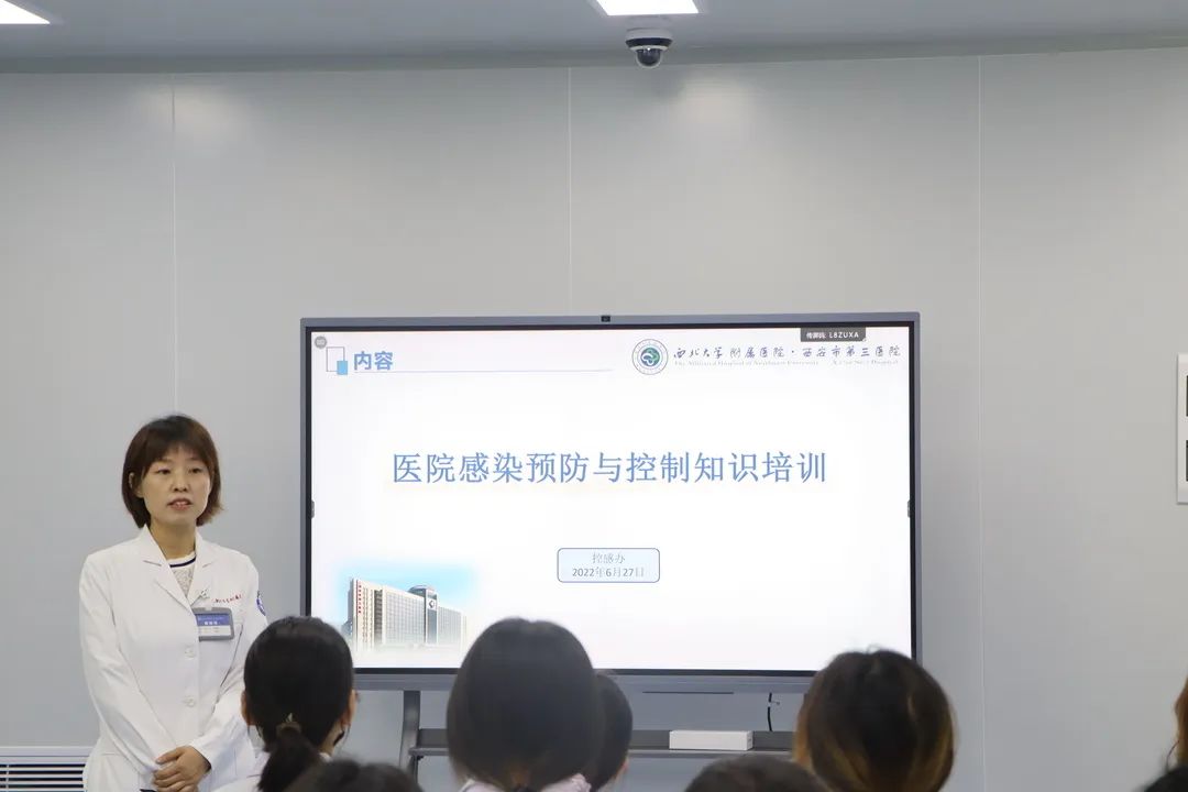 侯主任从案例引入、医院感染、手卫生、职业暴露、医疗废物的处理等五个方面展开培训,以近年来真实发生的医院感染案例,告诫在座师生医院感染防控的意义和重要性;依次介绍医院感染的概念和分类,手卫生的三个含义和六个步骤,重点讲解职业暴露的概念、分类和处置方法以及医疗废物的处理问题,生动形象带领在座师生深刻理解控感内涵,掌握具体操作要领;并对培训内容进行了回顾和小结,解答在座师生的疑惑。培训期间,同学认真听讲,积极互动,收获满满。