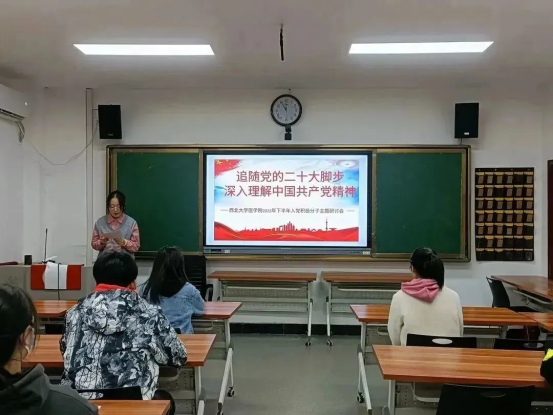 为贯彻党的二十大精神,加强入党积极分子党课理论学习,医学院党支部(直属)于近日组织全体入党积极分子开展“追随党的脚步,践行党的二十大精神”主题研讨活动。入党积极分子代表实际开展专题学习交流研讨,通过谈感悟、强落实,以党的二十大精神武装头脑、指导学习生活,夯实当代青年为实现中华民族伟大复兴而奋斗的责任感与使命感。为贯彻党的二十大精神,加强入党积极分子党课理论学习,医学院党支部(直属)于近日组织全体入党积极分子开展“追随党的脚步,践行党的二十大精神”主题研讨活动。入党积极分子代表实际开展专题学习交流研讨,通过谈感悟、强落实,以党的二十大精神武装头脑、指导学习生活,夯实当代青年为实现中华民族伟大复兴而奋斗的责任感与使命感。