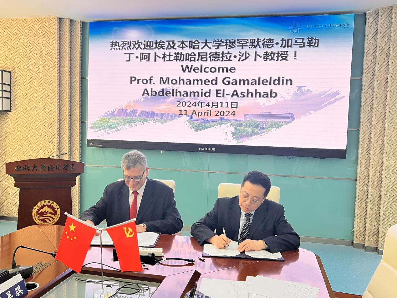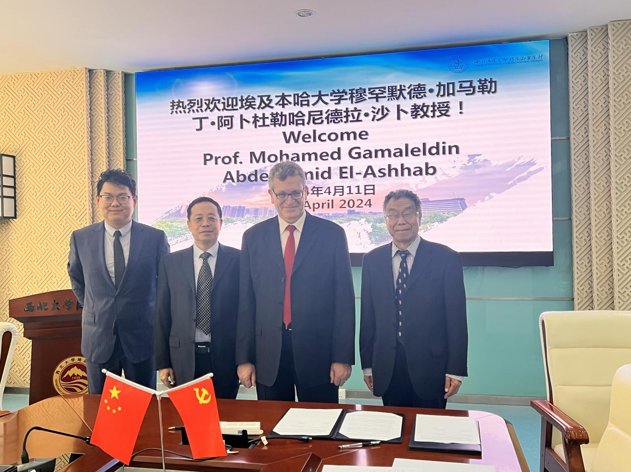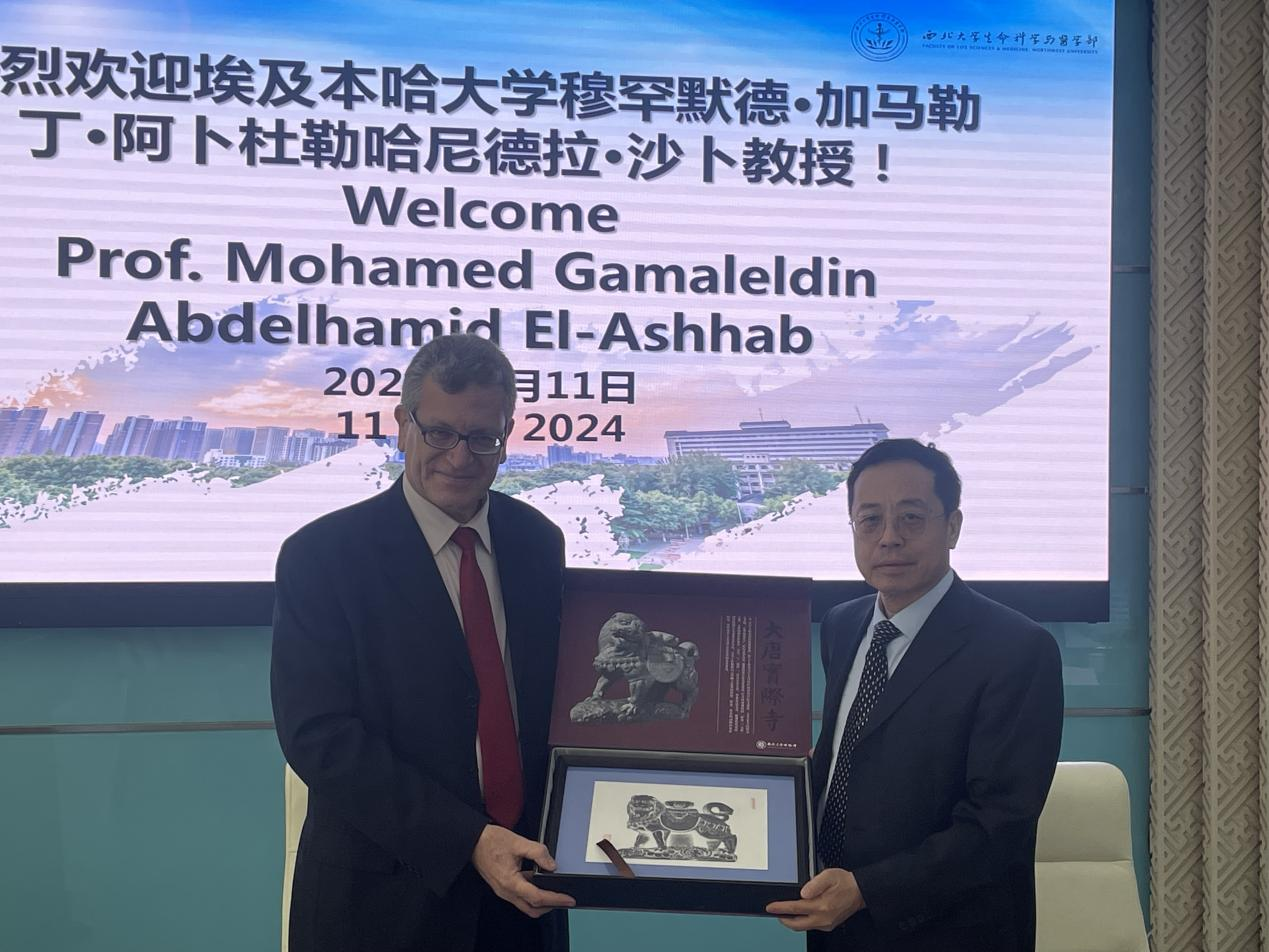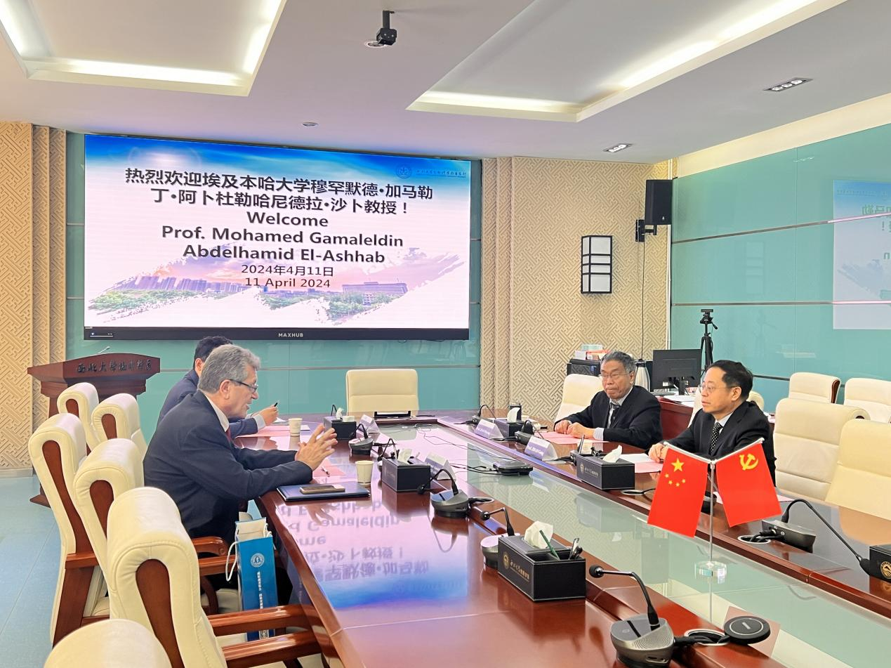 4月11日,埃及本哈大学医学院院长穆罕默德·加马勒丁·阿卜杜勒哈尼德拉·沙卜教授到访pg电子洽谈合作事宜。pg电子院长赵钢,陕西省国际医学交流促进会副会长、陕西省人民医院儿童病院名誉院长焦富勇相关负责人参加座谈。