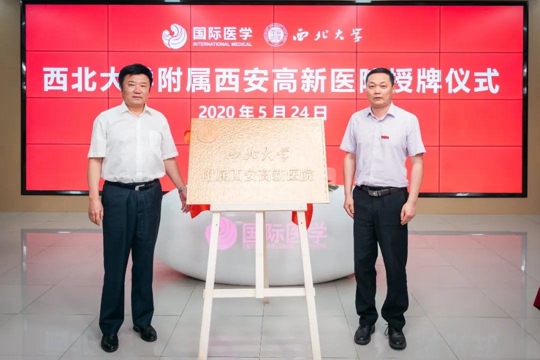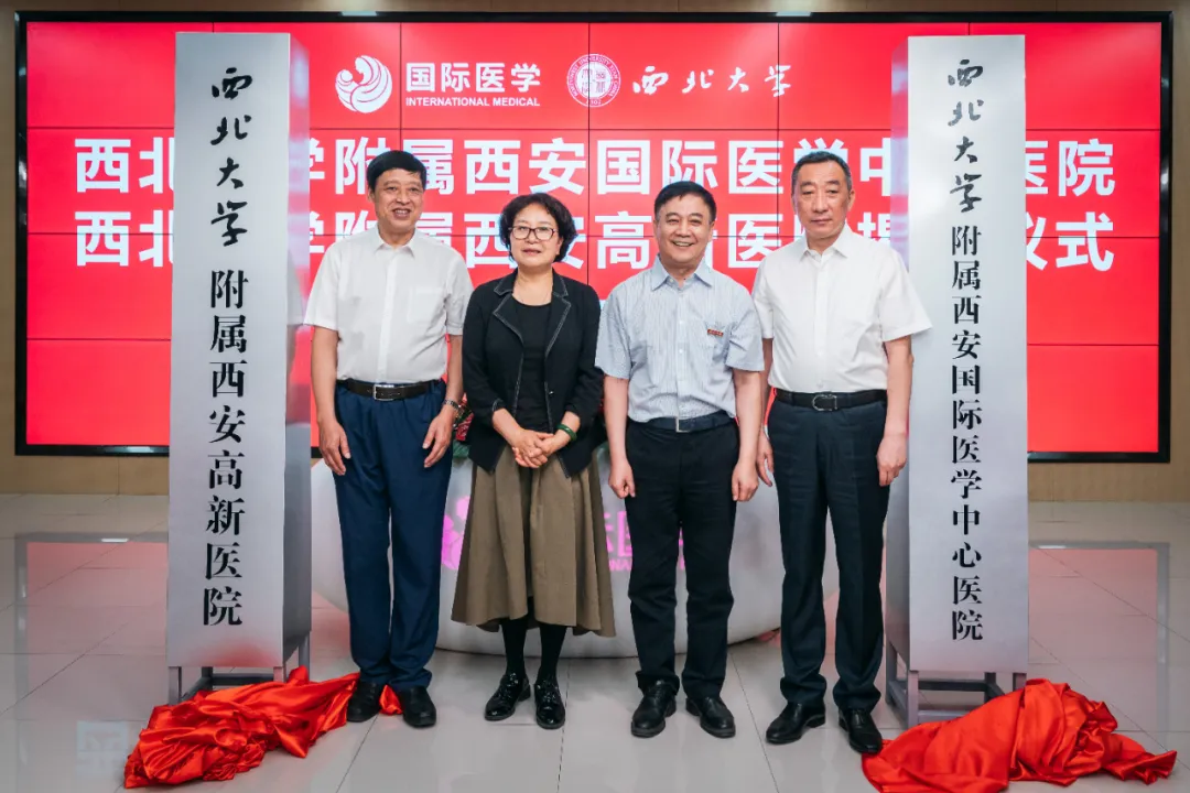 陕西省卫健委主任刘宝琴,pg电子官方网站党委书记王亚杰,校党委常委、副校长、pg电子官方网站主任常江,国际医学董事长史今,副总裁孙文国,西安国际医学中心医院院长尹强,西安高新医院院长马庆久出席仪式。学校党办校办、国内处、科技处、pg电子官方网站以及国际医学、西安国际医学中心医院、西安高新医院等相关部门负责人和医务人员代表到场见证揭牌。仪式由国际医学党委书记、总裁刘瑞轩主持。