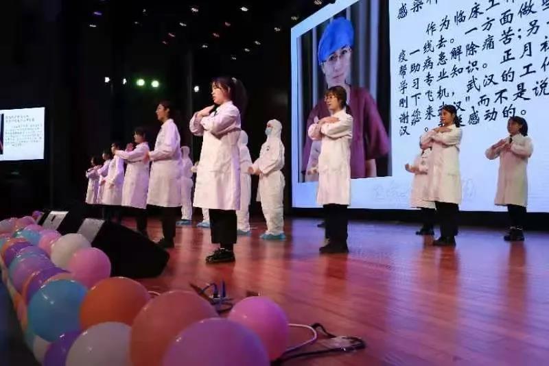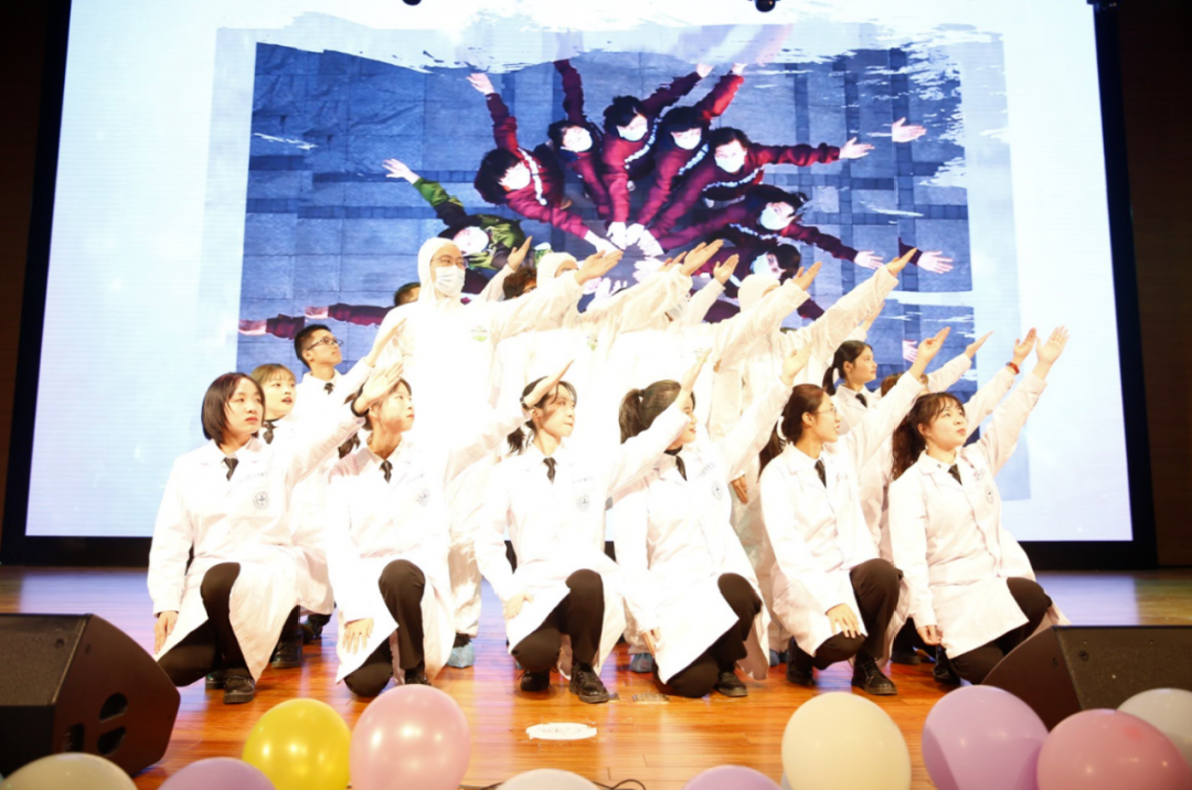 演出期间,同学们怀着对抗疫英雄的崇敬,伴随着高亢激昂的旋律,同学们精神饱满,动作干净利落,整齐划一,赢得在座师生的阵阵掌声。屏幕上展示的一张张附属医院赴鄂抗疫医护人员英勇奋战抗疫一线的的照片,带领师生重新回想起那段举国同心抗击疫情、逆行出征救死扶伤的时光,感动了全场观众,掀起比赛的高潮。