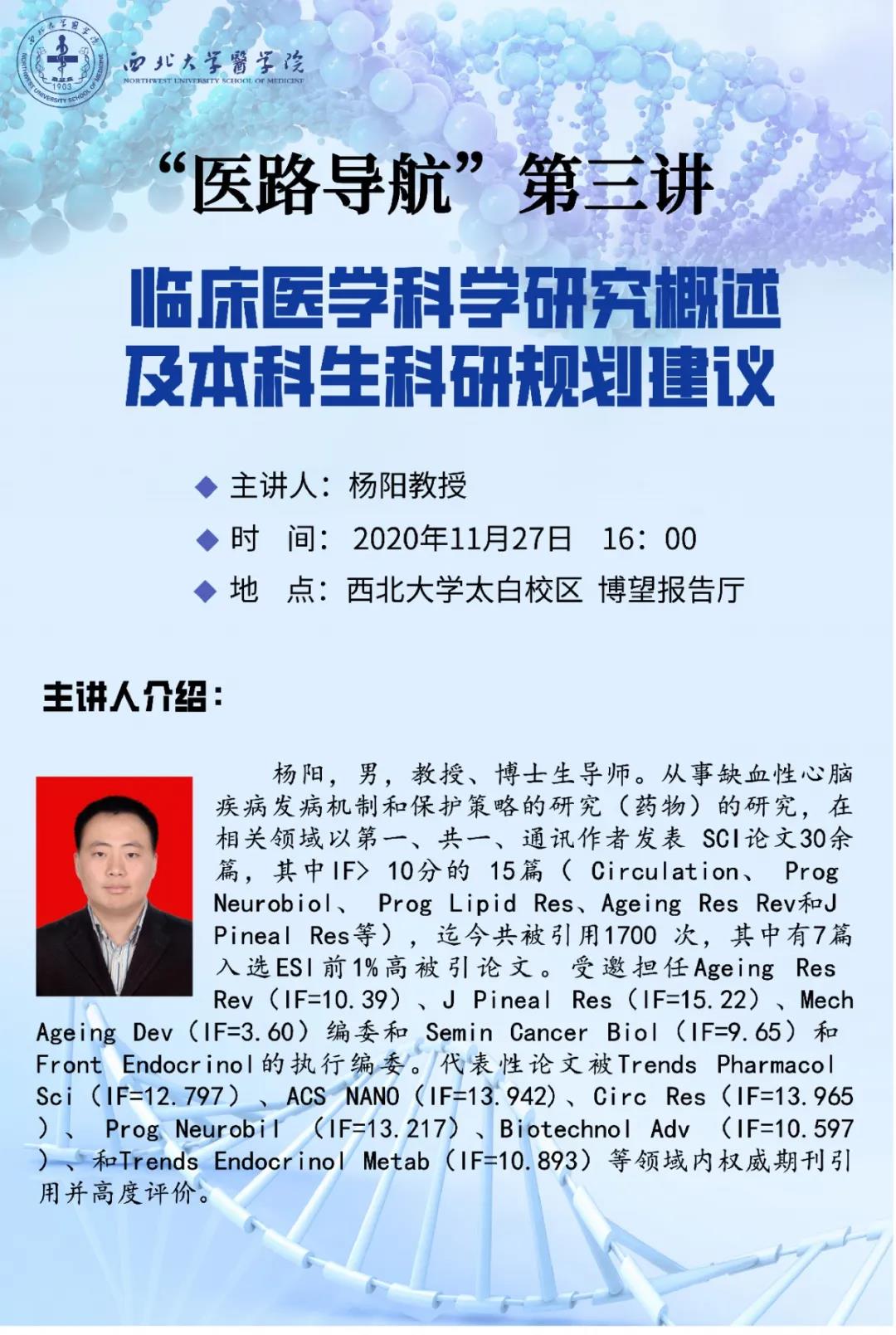 2020年11月27日,学院邀请学部教授、博士生导师、2020级生物医学科学班班主任杨阳为医学院全体学生做“临床医学科学研究概述及本科生科研规划建议”学术报告。本次讲座旨在指导医学生深入了解科学研究的目的和方法、进一步理解临床研究的重要性,指导学生树立严谨的科研态度,引导学生尽早尽快找准方向,走上科研探索之路。