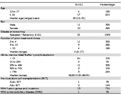 该项研究者发起在r/r B-ALL患者中使用anti-CD9 nvGT CAR-T,评估其安全性与有效性。招募患者21人,现已完成了所有患者的临床治疗和短期的安全性与疗效的评估。基线显示,入组患者为高风险、高负荷、经过多次既往治疗的患者。既往治疗中位数为4次(范围为2-17次),基线的骨髓肿瘤负荷中位数为38.8%(范围为0.3%~99%)。其中,4人移植后复发,15人伴有预后不良基因突变,1人伴有髓外病变。回输剂量中位数为3.8*10^6/kg个CAR阳性细胞。见下图