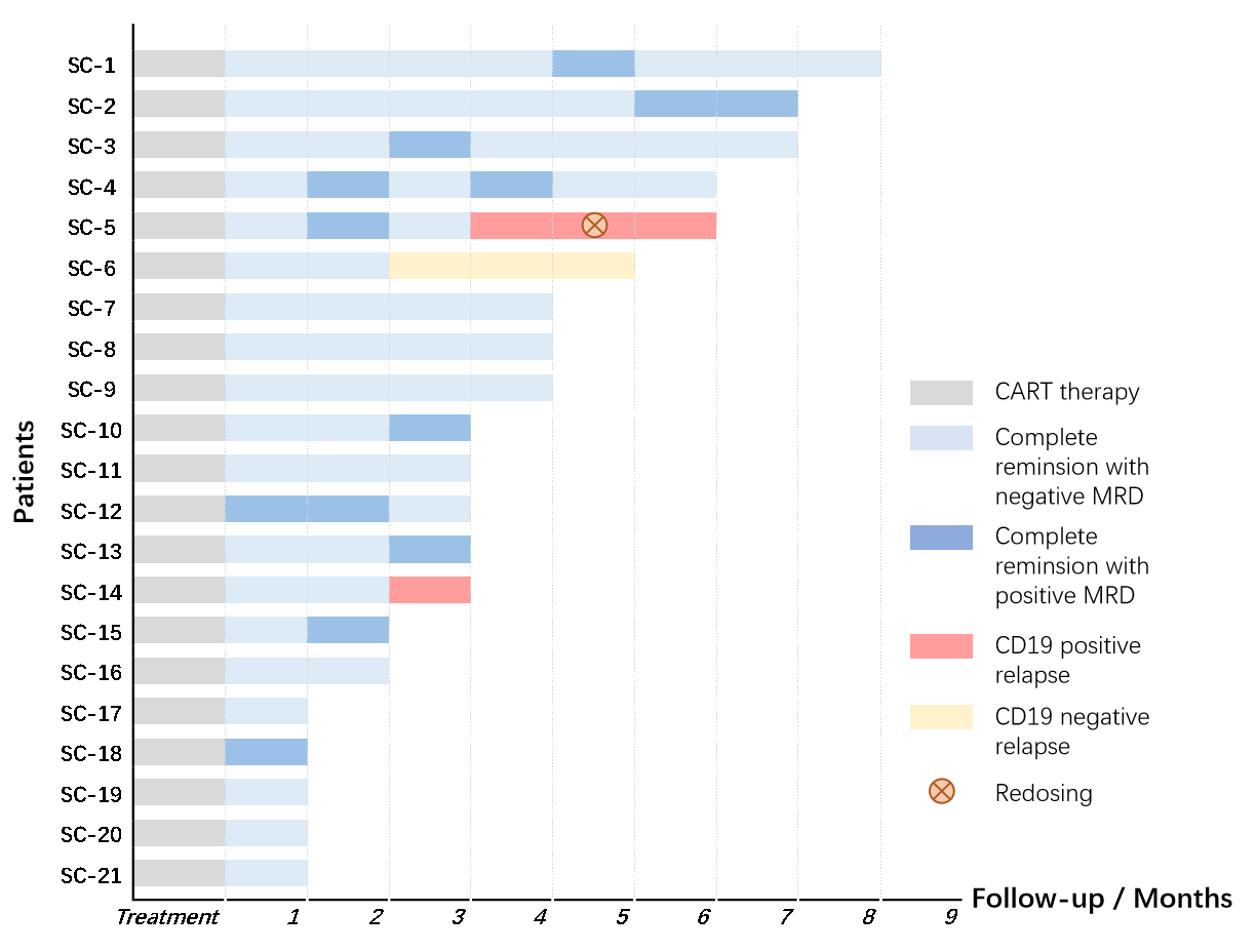 在治疗后30天,所有患者均达完全缓解(CR),其中19人达最小病灶阴性完全缓解(MRD negative CR)。在14为达治疗后三个月随访的患者中,11人仍未CR状态。3人复发,一位患者为CD19阴性复发,两位患者CD19阳性复发。其中一人再次回输,然而无效。患者SC-7乳腺髓外病变也完全消除。如下图。