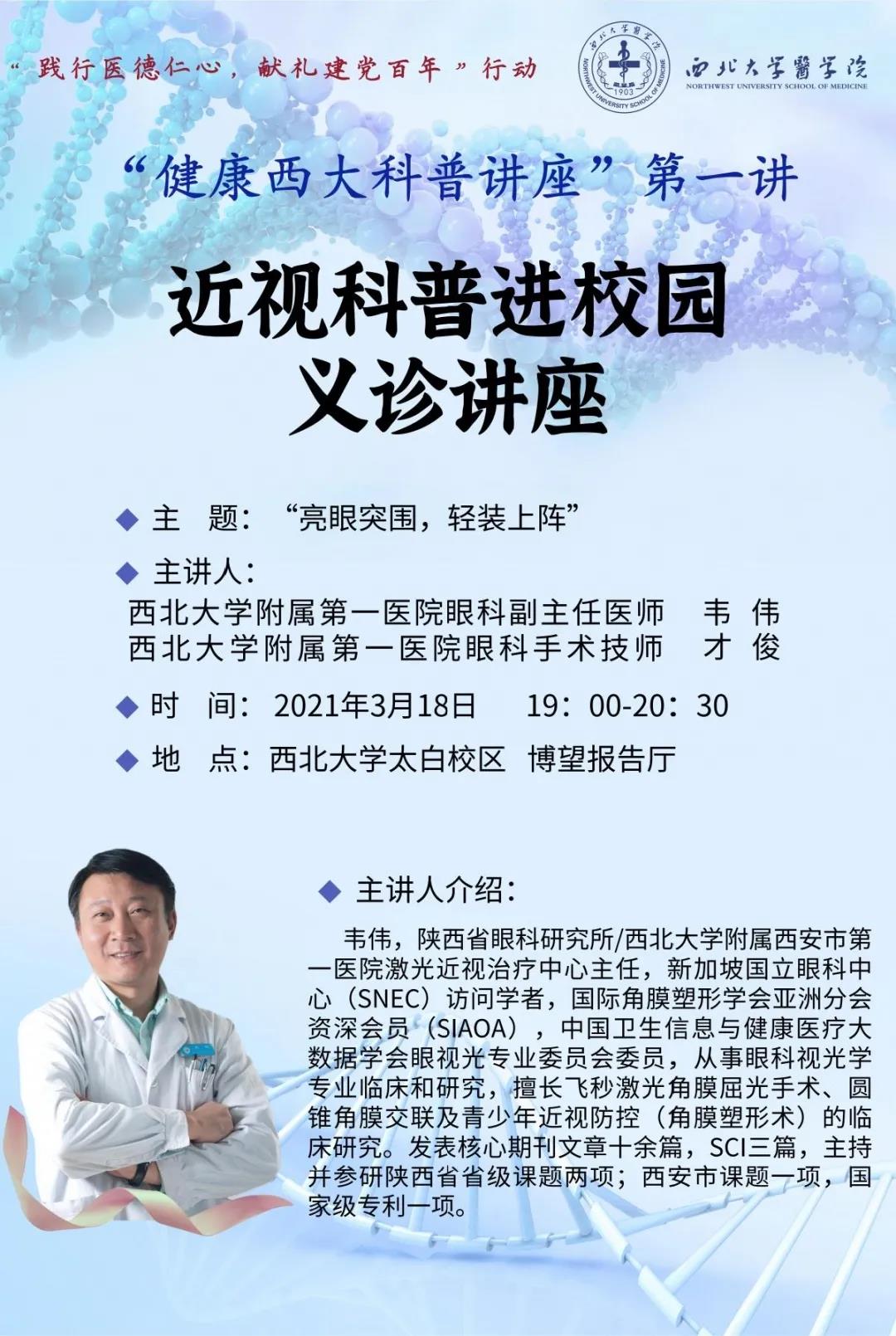 2021年3月18日,医学院邀请pg电子官方网站附属第一医院(西安市第一医院)眼科专家为全校师生带来“健康西大科普讲座”系列第一讲——近视科普进校园义诊讲座。pg电子官方网站附属第一医院(西安市第一医院)激光近视治疗中心主任韦伟、手术技师才俊、护士长赵艳,医学院党支部(直属)副书记杨涛、医学院专职团干雷蕾以及太白校区各个院系学生代表参与讲座。本次讲座由医学院团支部(直属)书记梁靖主持。