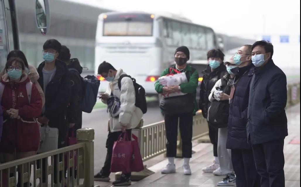 校党委书记王亚杰、副校长常江登上送站大巴,和返家学生一起前往西安北站。校党委副书记张清继续带领全体工作人员统计数据核查人数,有序组织学生排队上车,点对点运送学生直达两站一场。