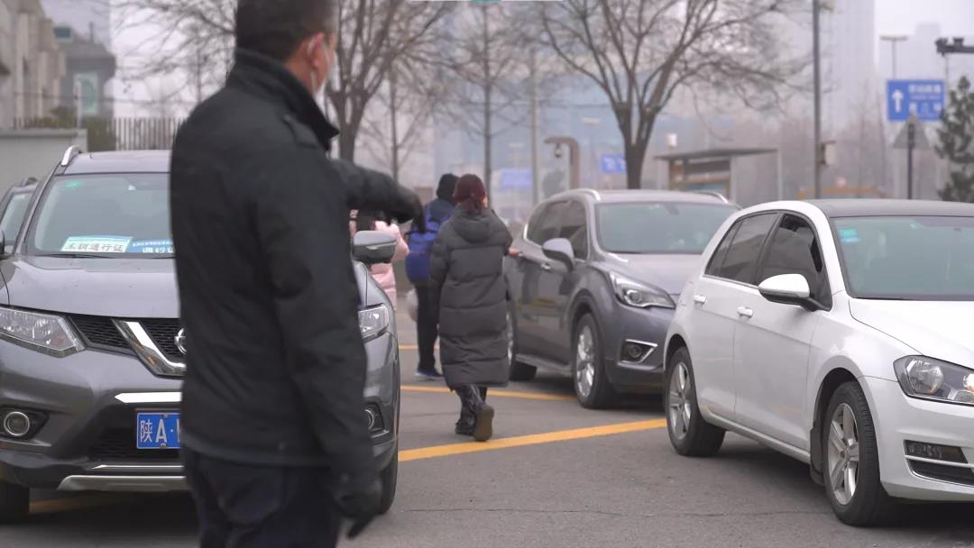 学生工作干部王志强、魏宁、孟庆彬、范铭沁、刘凌飞和保卫处张斌虎等人在学校北门对家长来车进行调度安排。