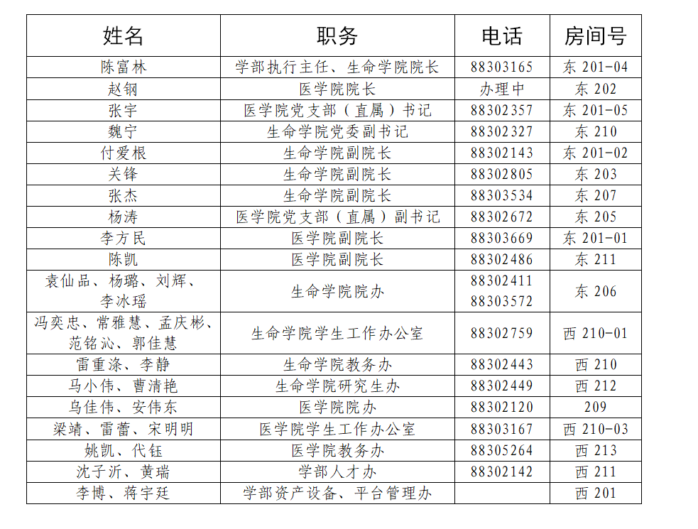 按照学校统一部署,根据事业发展需要,pg电子官方网站(生命科学学院、医学院)行政办公地点已集中搬迁至原文博学院2层,有关师生来访、办理学院事务请移步到学部新行政办公地点。